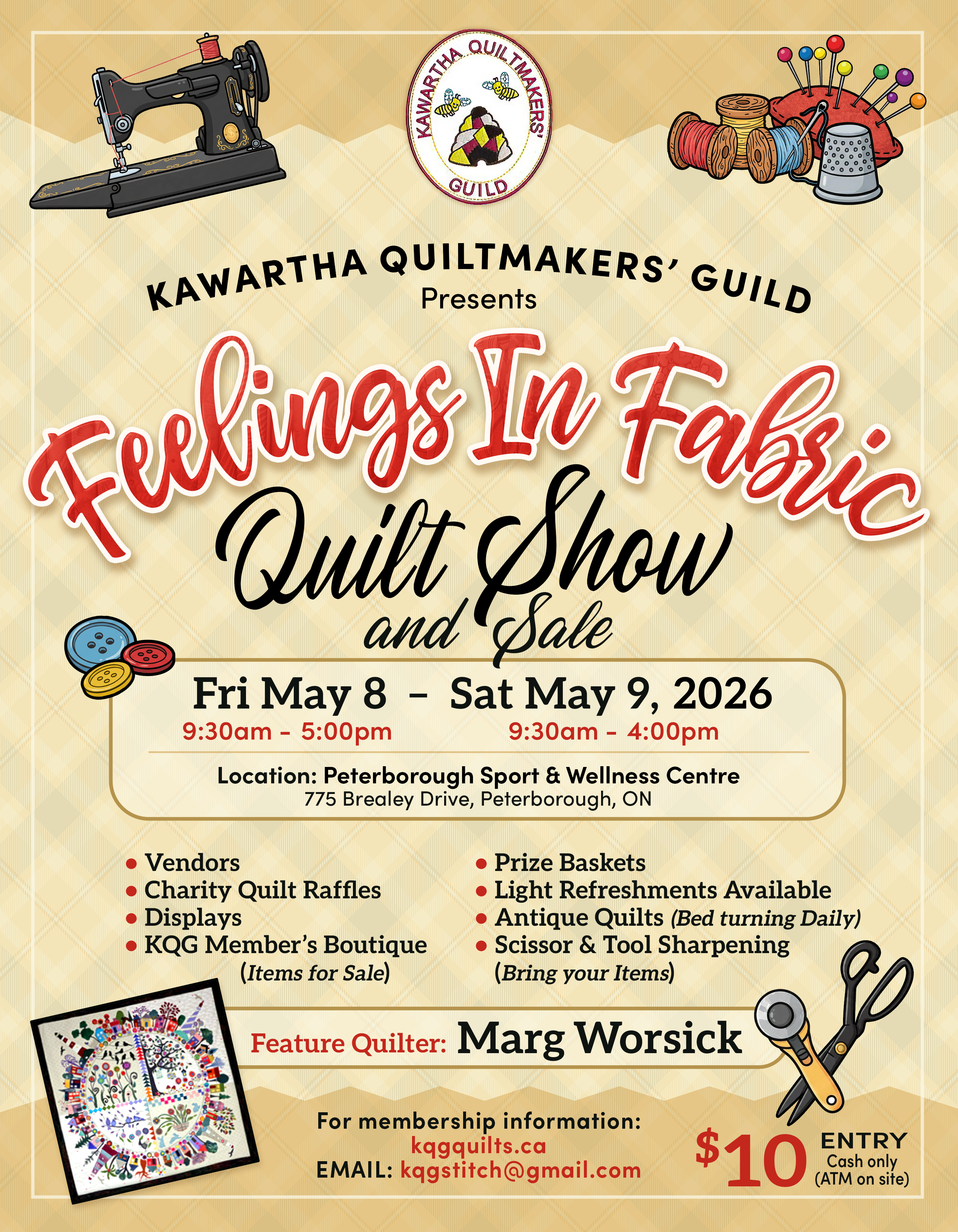 The Kawartha Quiltmakers’ Guild presents “Feelings in Fabric” Quilt Show and Sale on May 8, 9:30-5:00 pm and May 9, 9:30-4:00 pm.