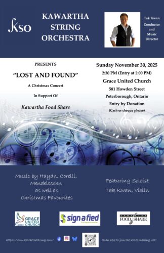 The Kawartha String Orchestra (KSO) is pleased to announce their annual Winter concert will take place on Sunday November 30 starting at 2:30pm at Grace United Church on 581 Howden St, Peterborough (corner of Monaghan and Howden).