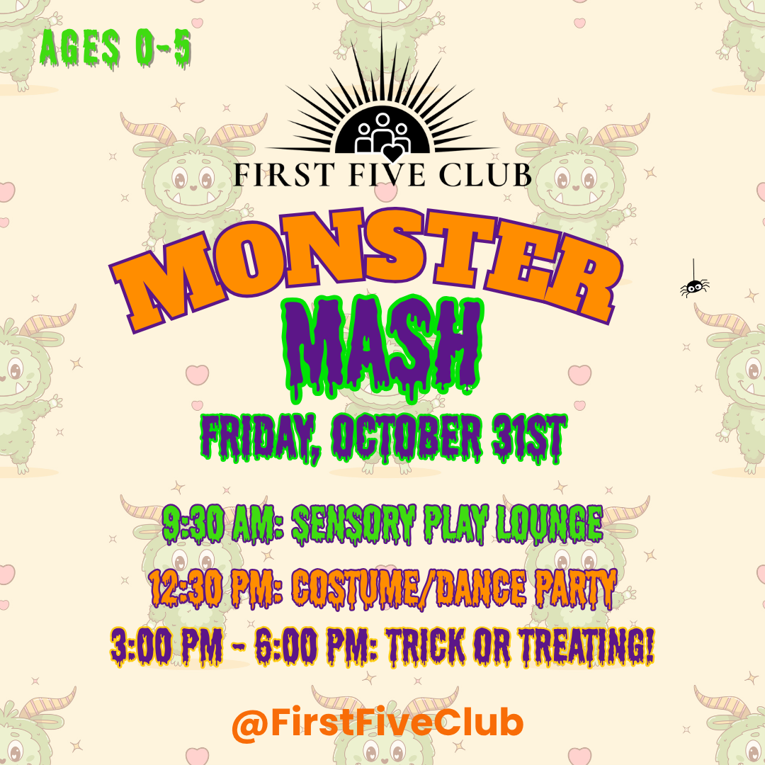 Monster Mash Day at First Five Club! It’s time to close out our Halloween celebration with a monstrous day of spooky, slimy, silly fun! Join us for hands-on sensory play, a costume dance party, and trick-or-treating around the club — the perfect way to wrap up an unforgettable week of Halloween magic.